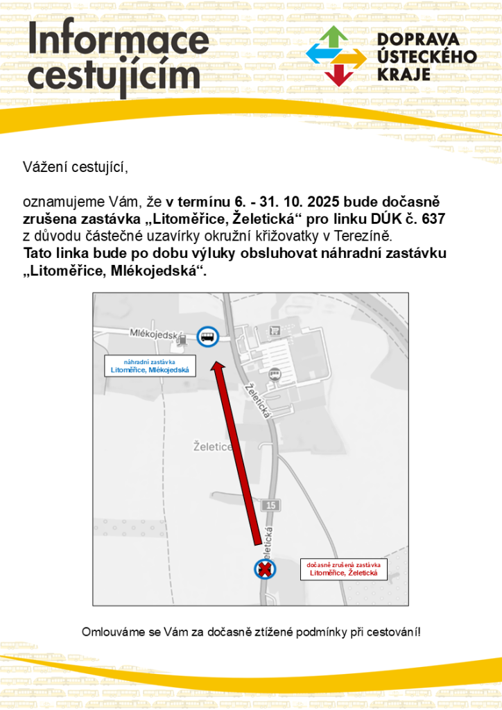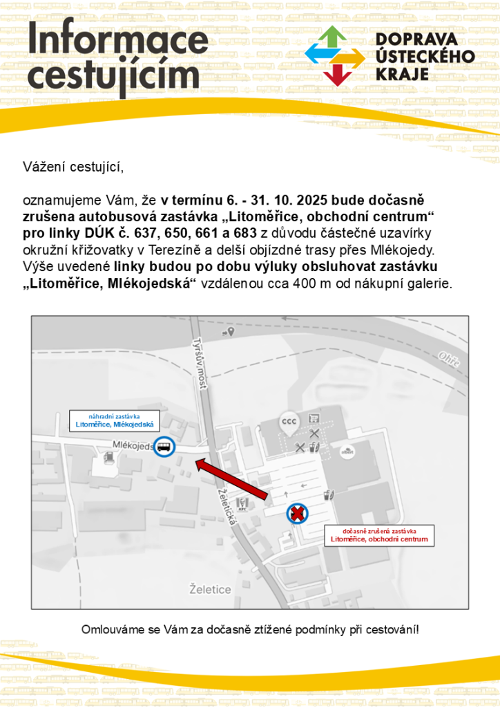 Od pondělí 6. 10. 2025, kdy se v rámci II. etapy rekonstrukce okružní křižovatky v Terezíně uzavře severní polovina této křižovatky, budou všechny autobusové linky projíždějící tímto místem (413, 623, 637, 650, 661 a 683) vedeny po objízdné trase přes Mlékojedy. Zastávky „Litoměřice, obchodní centrum“ a „Litoměřice, Želetická“ budou pro autobusové linky DÚK dočasně zrušeny, jako náhradní za zrušené zastávky bude obsluhována zastávka „Litoměřice, Mlékojedská“.