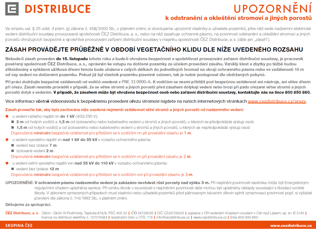 Upozornění ČEZ stran odstraňování a oklešťování stromoví a jiných porostů.